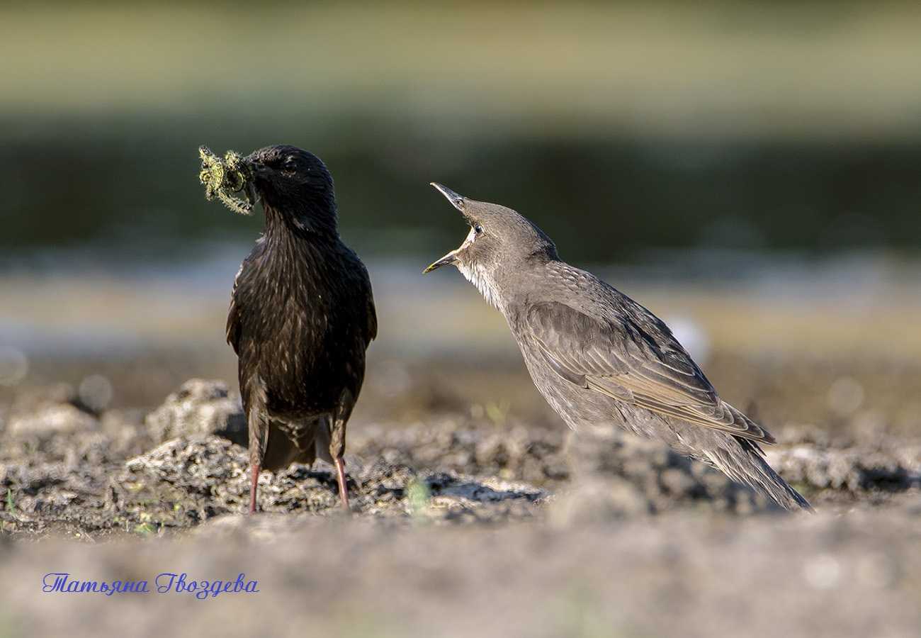 Вылупившиеся скворчата едва покрыты белесым пушком, они беспомощны, но уже могут оставаться одни, пока родители добывают корм. Делают это оба родителя одновременно. Малыши невероятно прожорливы, поэтому чтобы накормить своих детишек, папка с мамкой совершают до 300-400 вылетов в день в поисках корма.