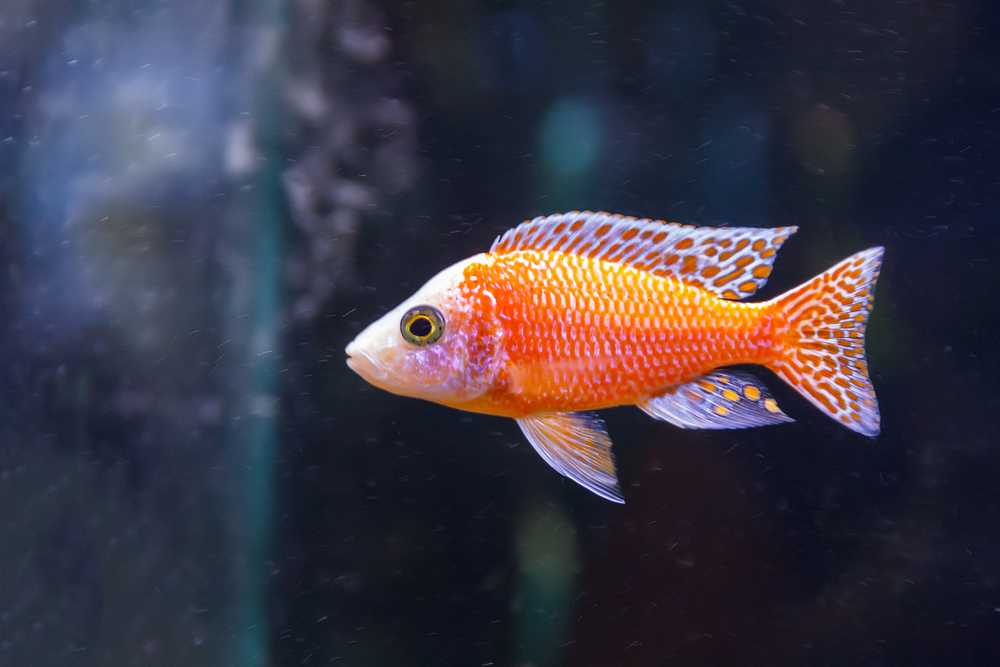 - Красный дракон. Эту рыбку аквариумисты часто называют «огненной рыбкой» или «аулонокара земляника». Вырастает она в длину до 13-15 см. Цвет тела и плавников — красно-оранжевый с пятнами, отливающими голубоватым или белым цветом.
