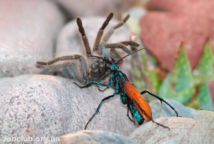 Она должна выгнать паука из укрытия, чтобы у нее было пространство для маневра. После его изгнания оса начинает демонстративно ухаживать за собой, провоцируя птицееда на атаку.