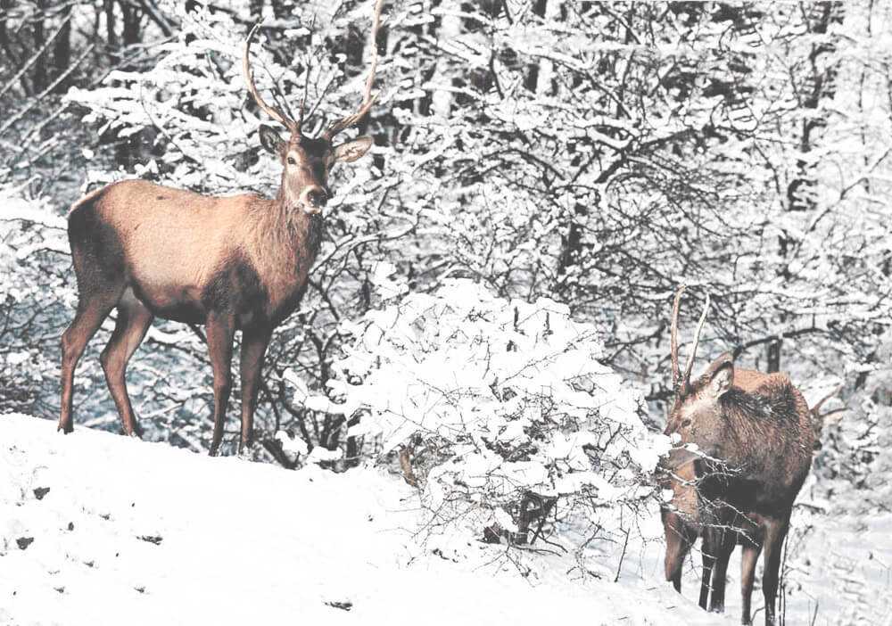 В период зимних похолоданий приходится обгрызать кору деревьев или ветки растений. Отсутствие нормального содержания минералов в зимней пище животные восполняют солью из солонцов или минеральных источников. Также они могут грызть землю, которая достаточно пропиталась солями и минералами. Если в организме нет нужного количества белка, звери начинают есть свои сброшенные рога или яйца птиц.