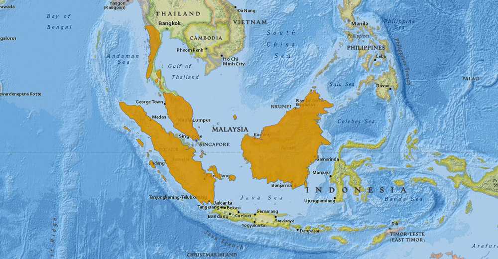 Обитает на Суматре , Борнео и небольших островках Малайзии и Индонезии , а также на юге Мьянмы , на юге Таиланда и на полуострове Малайзии.