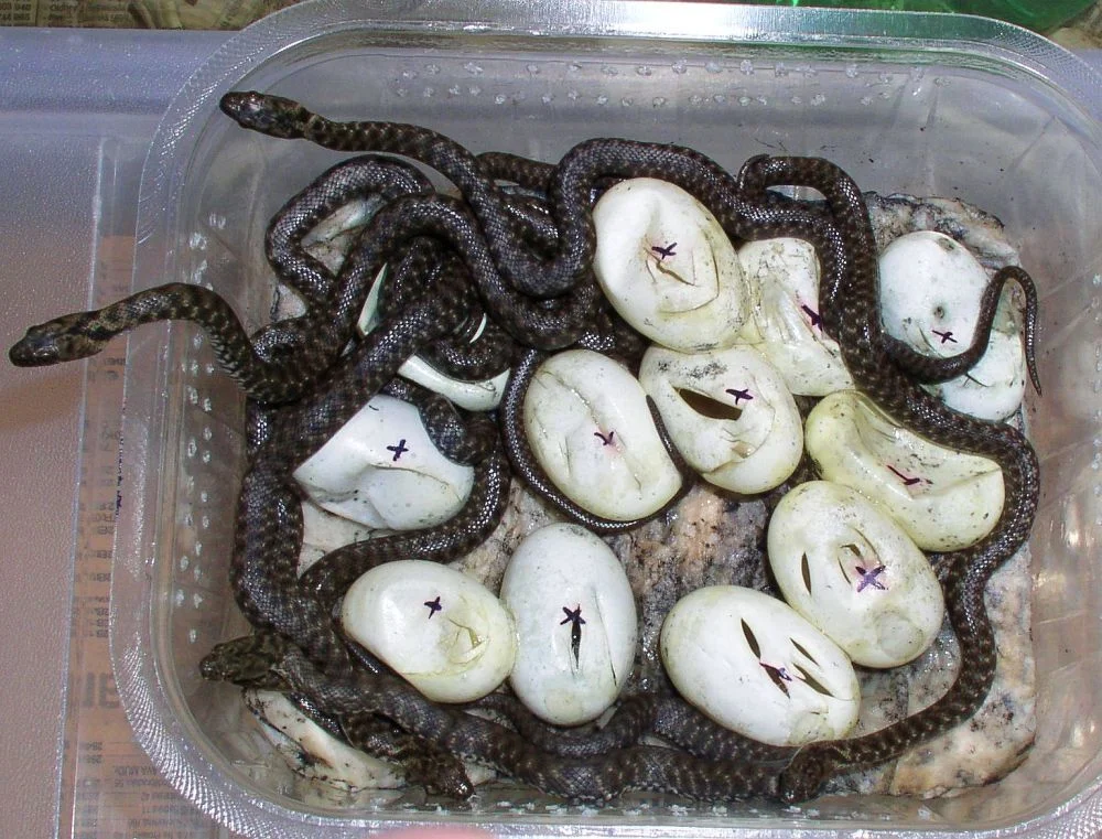 Впервые увидев свет, ужонок осторожно высовывает голову и при малейшей опасности прячется обратно в яйцо. Лишь убедившись, что ему ничто не угрожает, он выскальзывает из скорлупки