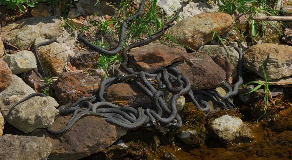 Бывает, уж зимует в одиночестве, но чаще всего змеи сползаются зимовать вместе большим коллективом, иногда в месте зимней спячки собираются несколько сотен рептилий. Причем зимовать водяные ужи могут вместе с обыкновенными ужами.