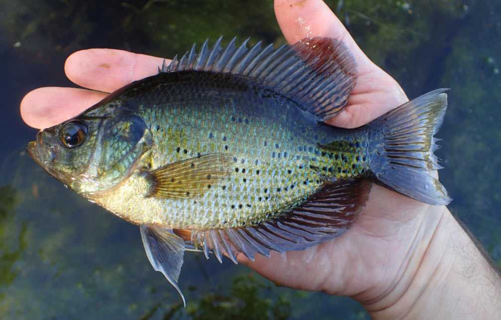 Лучепёрая рыба из семейства Центрарховые и отряда Окунеобразные. Представители вида населяют болотистые водоёмы со стоячей водой. Рыба имеет округлое и сжатое с боков тело оливково-серого цвета с наличием зелёного оттенка и рядами буроватых точек. Плавники покрывают характерные блёстки и тёмные крапинки.