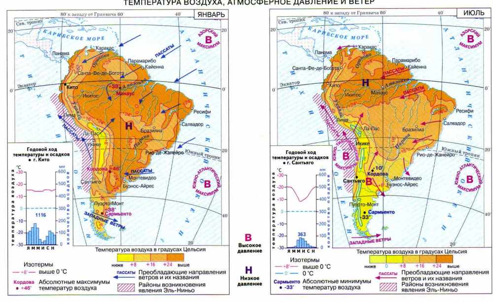 - Тропический пояс расположен в центре материка и делится на две части. Западный сектор с переменно-влажными лесами, осадки выпадают у подножия Кордильер, общее количество около 2000 миллиметров в год. Восточный сектор представлен саваннами и пустынями. Здесь наблюдается недостаток осадков: их выпадает не более 500 миллиметров в год. Температура в тропическом поясе составляет около +32 градусов летом и +24 градусов зимой.