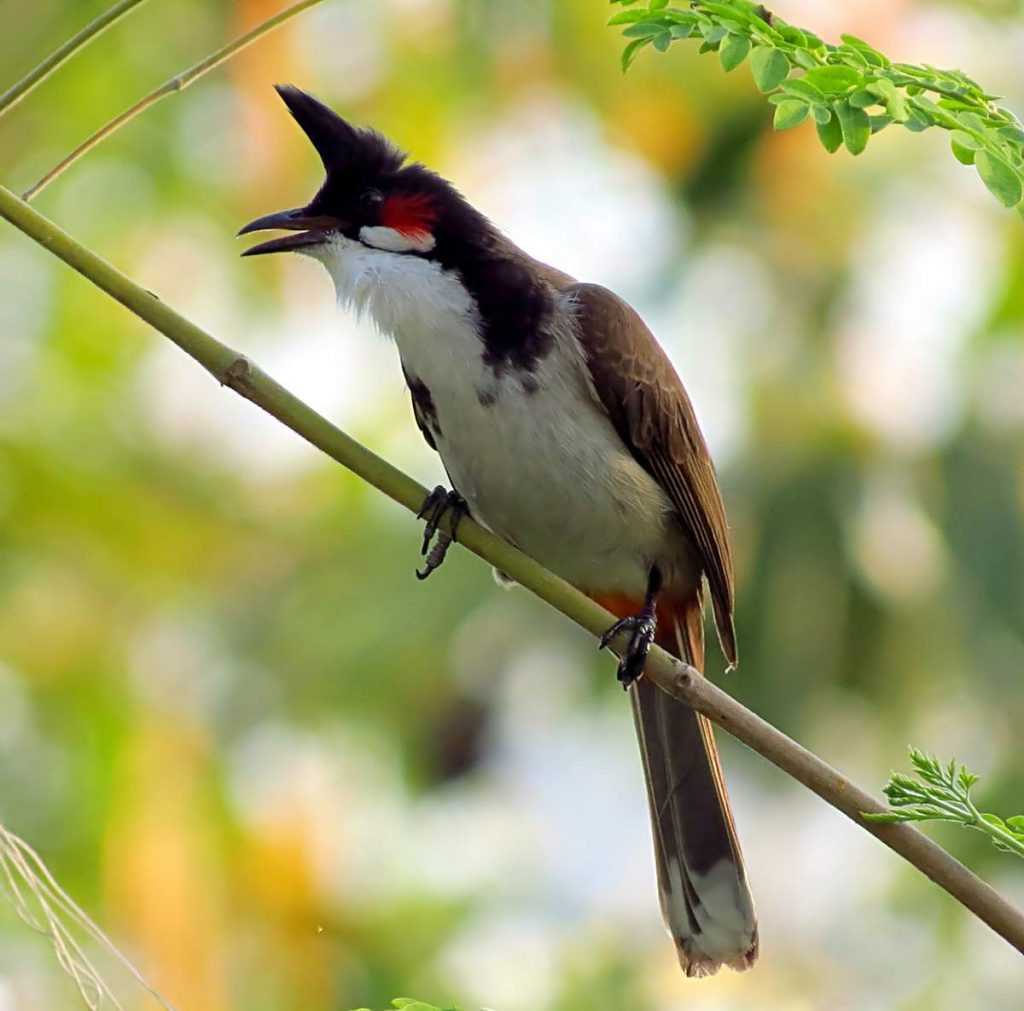 Голос краснощекого настоящего бюльбюля похож на радостный свист человека.