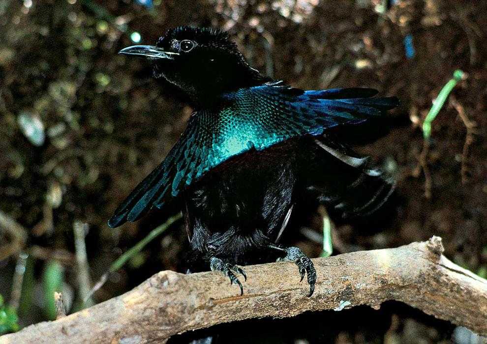) может похвастаться необычным способом демонстрации своей красоты во время брачного танца, во время которого самец, повиснув на ветке вверх головой, распускает свои синие перышки.