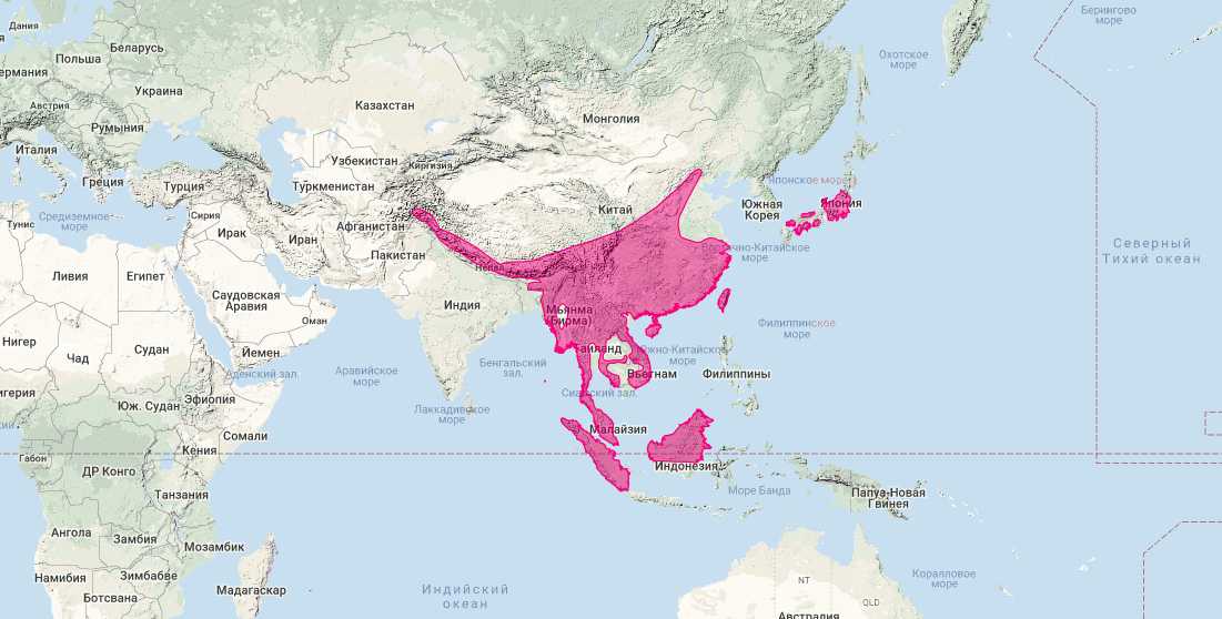 Индия, Бирма, Южный Китай, Индокитай, Малакка, Малайзия, Таиланд, Вьетнам, Камбоджа. Острова — Борнео, Суматра и Калимантан, Tайвань, Хайнань, Большие Зондские, Андаманские и Никобарские. В середине 1900-ых годов была интродуцирована в Японии (о-ва Хонсю и Сикоку).