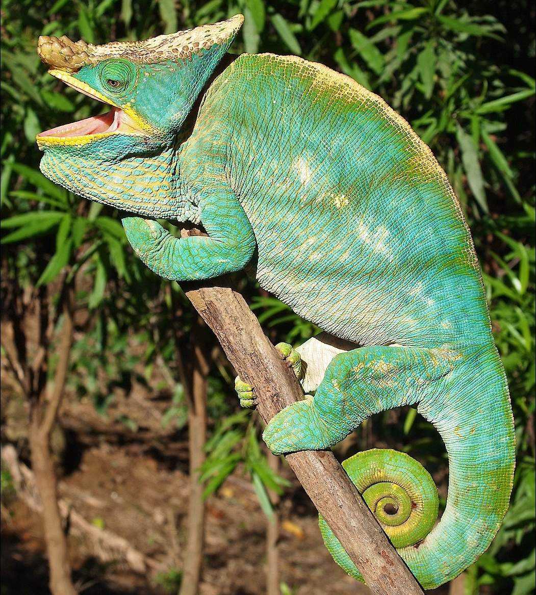 Обитающий на острове Мадагаскар гигантский хамелеон примечателен тем, что этой самый большой хамелеон в мире. Длани его тела достигает 68 см. Имеет коричневое туловище, усыпанное желтыми, зелеными и красными пятнами.