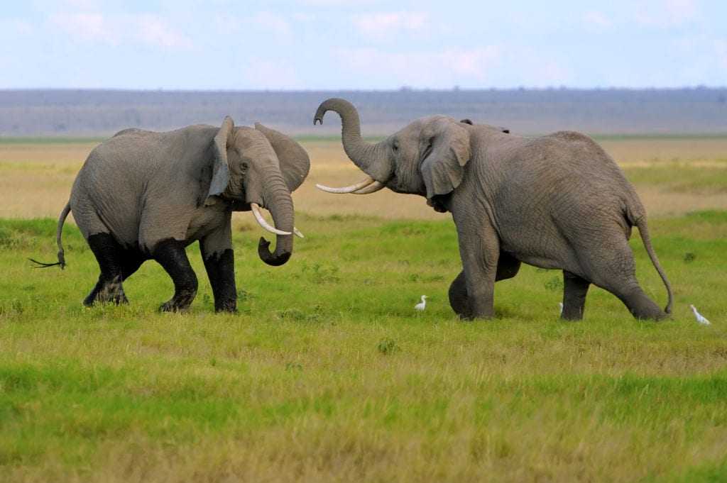 Поединки между самцами скорее ритуальные, и призваны продемонстрировать силу и мощь, а не нанести вред сопернику. Возбужденные ухажеры на глазах избранницы становятся друг против друга, растопыривают уши и громко трубят. Если размеры и голос претендентов равны, они начинают меряться силой, валя деревья и бросая в сторону стволы. Обычно, этого достаточно, чтобы один из самцов признал себя побежденным и уступил. В очень редких случаях дело доходит до настоящей схватки, и тогда слоны сцепляются хоботами и бивнями, стараясь повалить конкурента на землю.