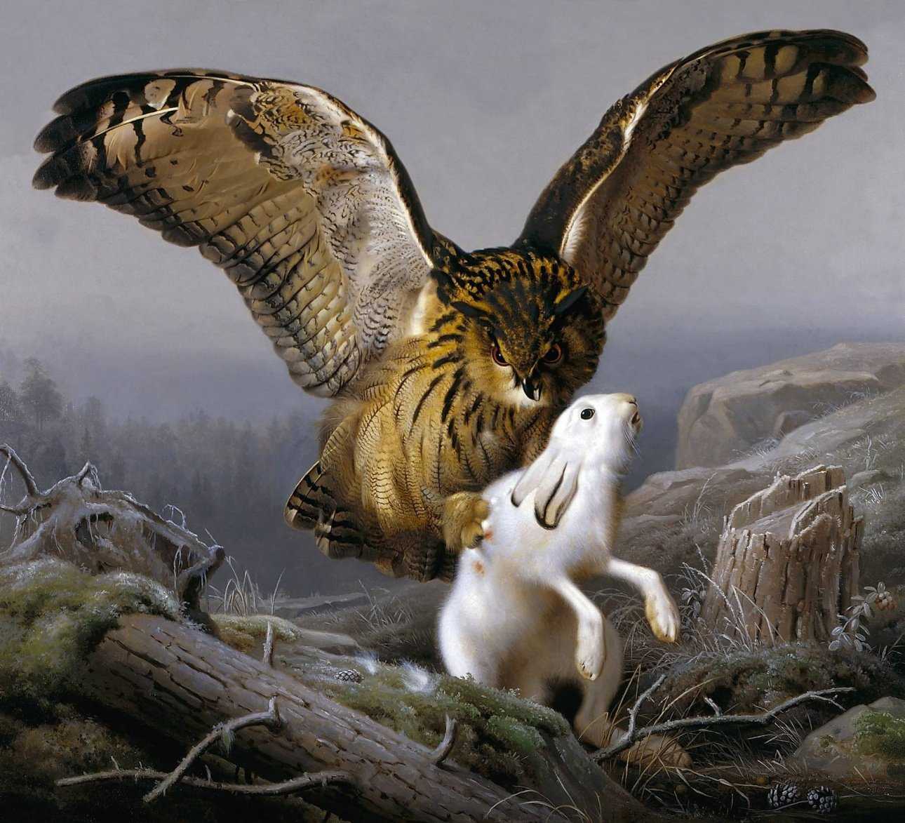 - Филин − самая крупная хищная птица из ныне известных. Крупная особь запросто завалит молодого кабана или беркута. На птиц может охотиться прямо во время полета.