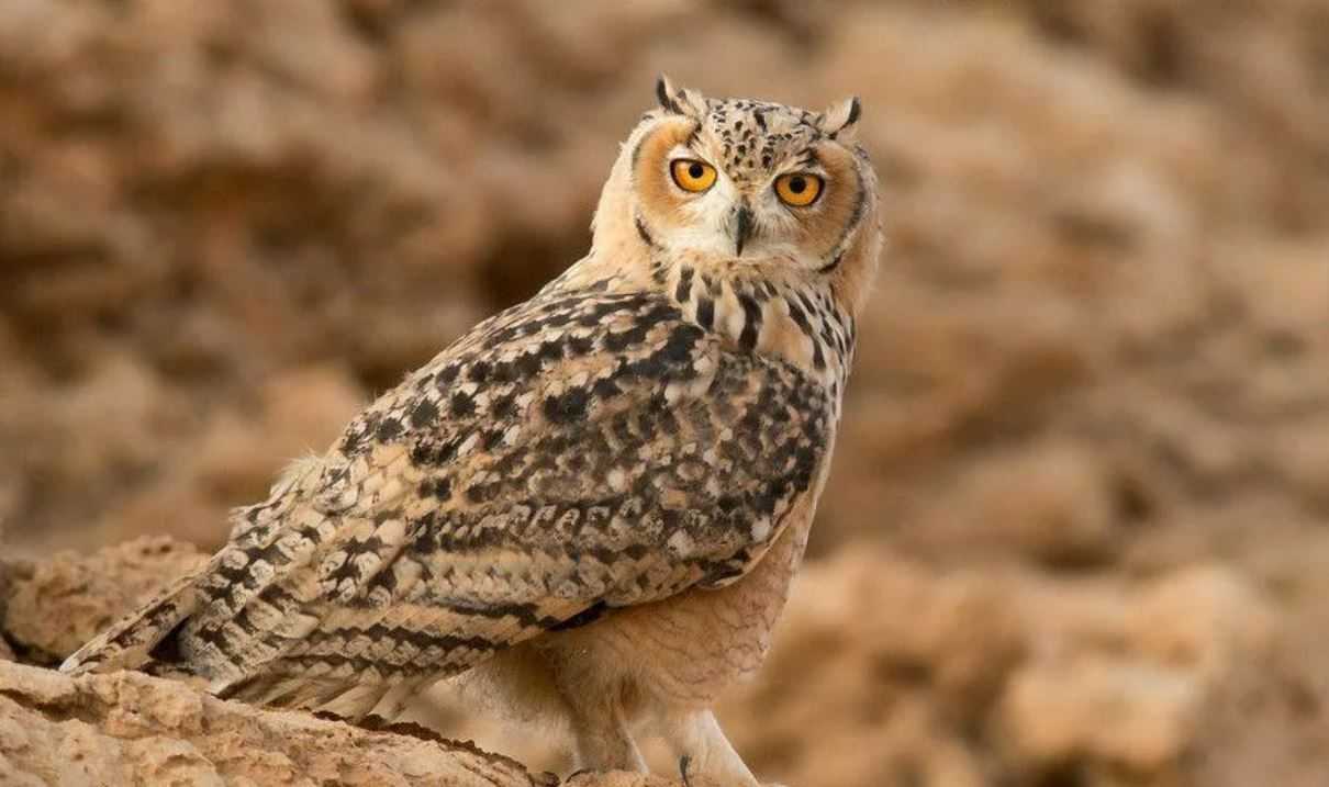 В поисках жертвы птица всецело полагается на острый слух и отличное зрение. Мягкое и очень плотное оперение позволяет совершать бесшумные полеты. В воздухе из-за округлых широких и длинных крыльев пустынный филин напоминает летящего орла.