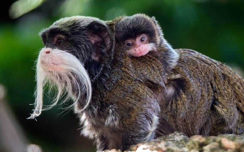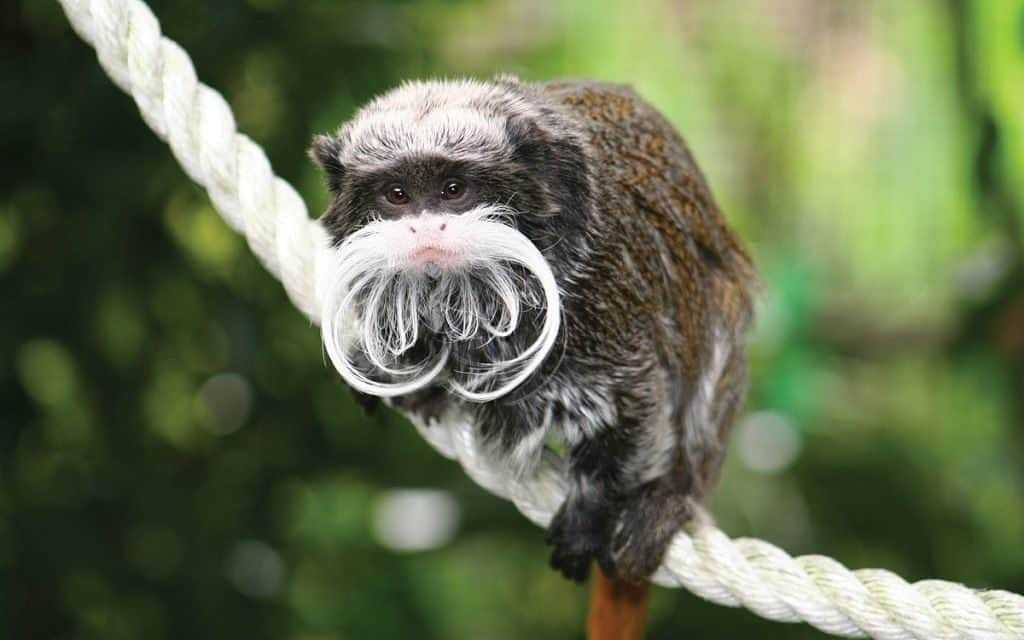 Еще одна самая маленькая обезьянка, тамарин, также представляет семейство Игрунковые отряда Приматы. Другое название представителей этого вида – сагуины. Их тела достигают в длину 18-30 см, а вместе с хвостом –25-45 см. Вес составляет от 200 до 900 г. Окрас тамаринов включает в себя 3 основных цвета – черный, коричневый и белый. Отличительной особенностью сагуинов является наличие длинных, пышных, закручивающихся «усов». Их может дополнять грива, «борода» или кустистые брови, – это зависит от конкретного подвида.