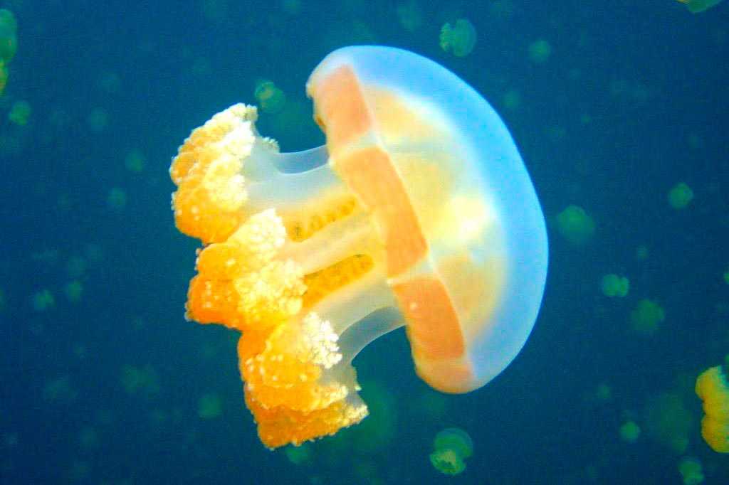 В необычном водоеме встречается два вида медуз — ушастая (Aureliaaurita) и золотая (Mastigiaspapua). Интересно, что популяция ушастых медуз, которых еще называют обыкновенными или лунными, огромна. Они встречаются по всей планете, и особенно много ушастых медуз в водах умеренного и тропического поясов, в Черном и Средиземном морях. Этот вид медуз широко распространился по миру, так как способен выдерживать значительные колебания температур и солености воды.