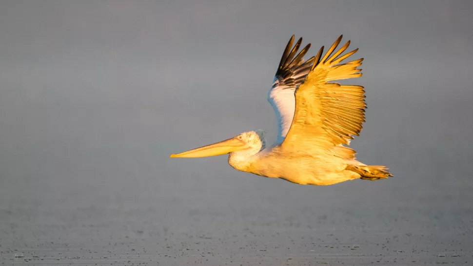 Кудрявый пеликан летит над озером Керкини, Греция. (Изображение предоставлено: Getty Images)