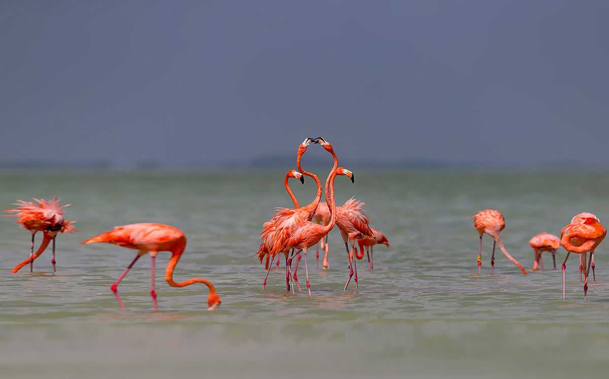 Летящих фламинго сравнивают также с электрической гирляндой, чьи звенья то вспыхивают ярко-красным, то гаснут, демонстрируя наблюдателю темные краски оперения. Фламинго, вопреки своей экзотичной красоте, могут жить в условиях, угнетающих других животных, например, рядом с солеными/щелочными озерами.