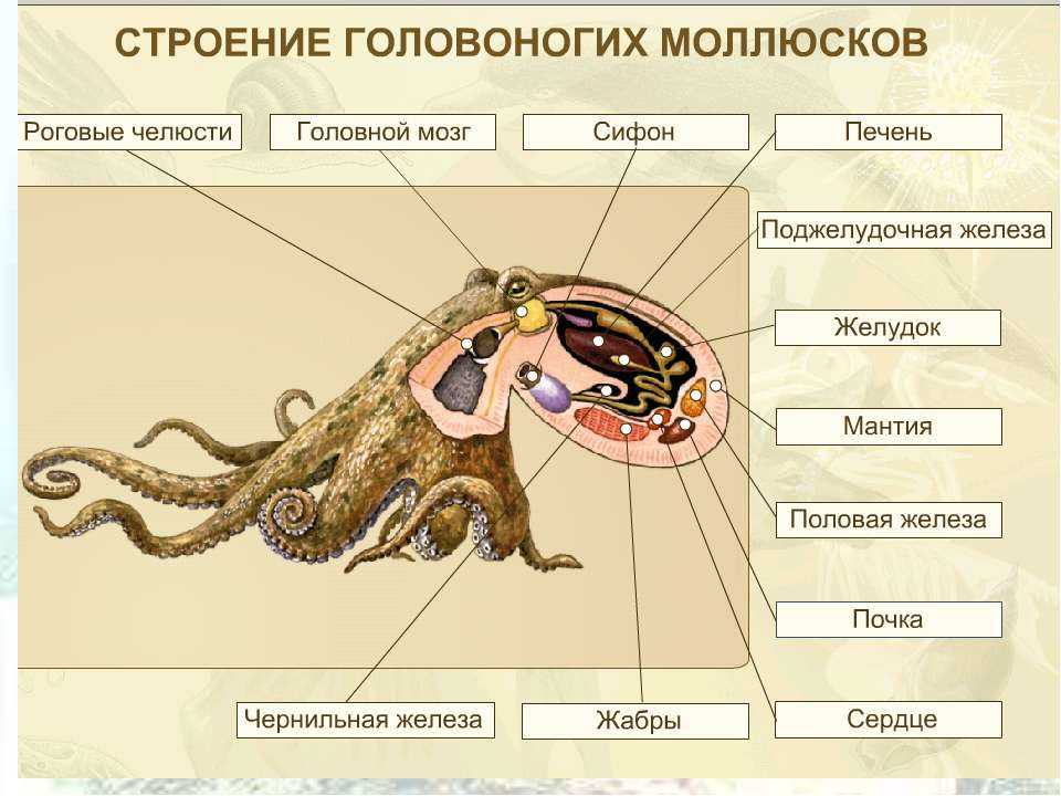 Головоногие моллюски не имеют раковины, способной сдерживать их движения. Среди этих поистине удивительных существ животного мира имеются и активно-ядовитые представители. Щупальца головоногих (от 8 до 10) несут на себе многочисленные присоски или крючки. Кроме этого, рот окружен крепкими роговыми челюстями с радулой (длинной эластичной лентой с многочисленными зубчиками) и напоминает по форме клюв попугая, размеры его варьируются в зависимости от размера моллюска.