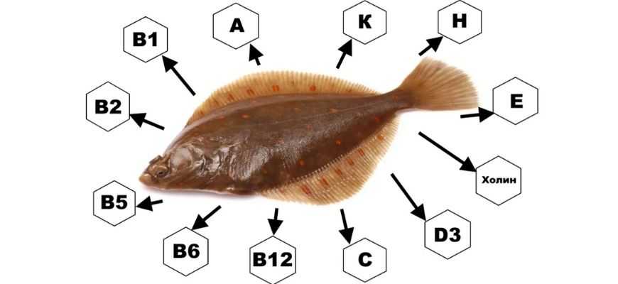 Также камбала содержит Омега-3, соли фосфора. Среди витаминов, которые содержатся в этой рыбке, можно отметить B12, A, D, E. Они выполняют следующие функции: