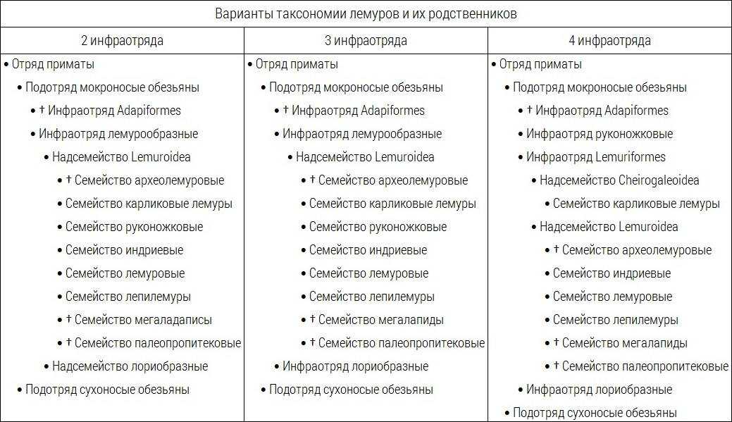 Таксономическая классификация лемуров до сих пор не определена и является дискуссионной. Существует несколько классификаций, которые представлены в таблице ниже.