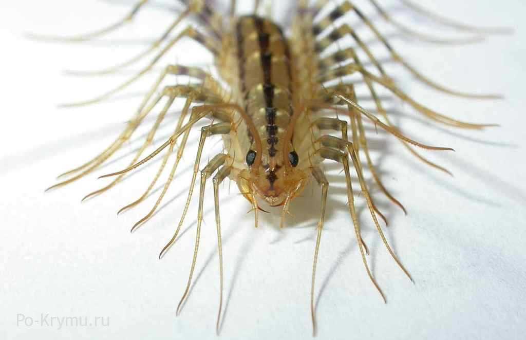 | Мухоловка скутигера | Многоножка длиной до 60 мм, имеет желто-серый окрас, полосатые ножки. Обитает в Европе, Средней Азии, России, Украине, Кавказе. Ищет убежища во влажных подвалах и канализациях. Можно встретить в ванной комнате или туалете. Вид безопасен для человека и несет угрозы. |