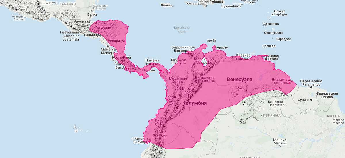 Распространен от крайней восточной части Гватемалы через Гондурас, Никарагуа, Сальвадор, Коста-Рику и Панаму до Колумбии, Эквадора, центральной Венесуэлы, центрально-западной Гайаны и северного Перу.
