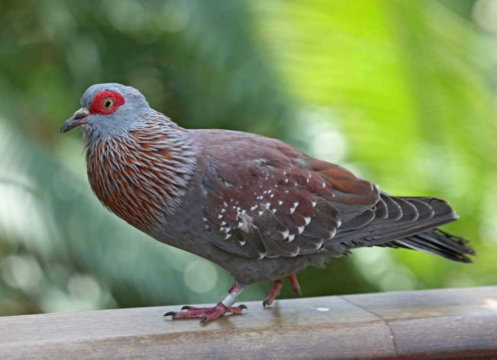 Молодые крапчатые голуби в большей степени окрашены в бурые тона, чем у взрослые птицы, у них отсутствует красная кожа вокруг глаз.