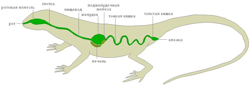 Рот, ротовая полость, глотка, желудок, пищеварительные железы, поджелудочная железа, печень, тонкий и толстый кишечник, клоака — таковы отделы пищеварительной системы пресмыкающихся.