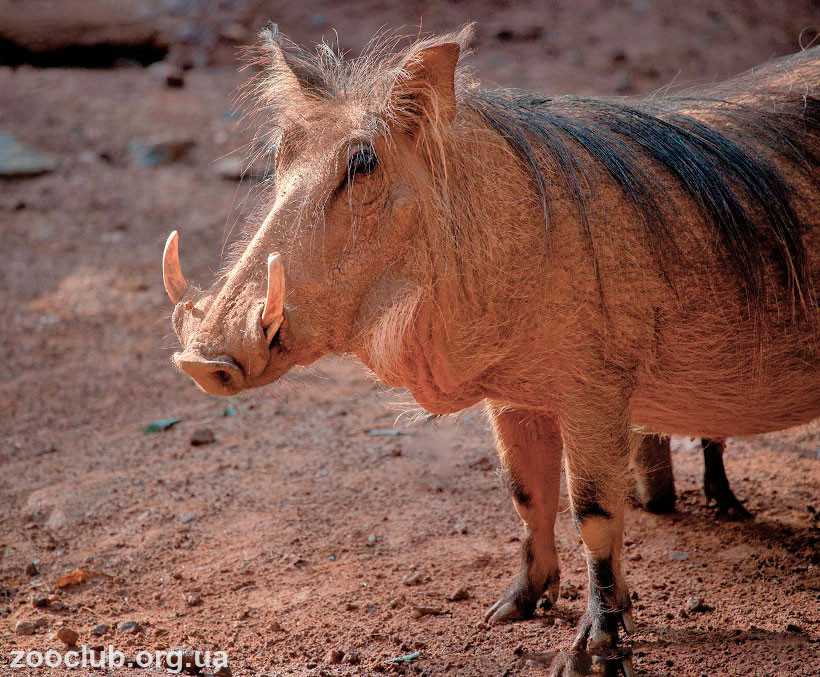 ) на первый взгляд весьма непривлекателен, так как его морда покрыта множеством бугров, похожих на бородавки, и чем старше животное, тем крупнее его бородавки — у старых же самцов вся морда бывает покрыта крупными шишками. По всей спине этого «чудовища», от затылка до хвоста, по хребту тянется довольно длинная рыхлая грива; его глаза с густыми ресницами окружены жесткой щетиной, такая же щетина образует на нижней челюсти заметные бакенбарды; картину дополняют огромные кривые клыки, достигающие 30 см в длину (рекорд — 67 см!). От африканских бородавочников пустынные отличаются отсутствием функциональных резцов и меньшими размерами тела.