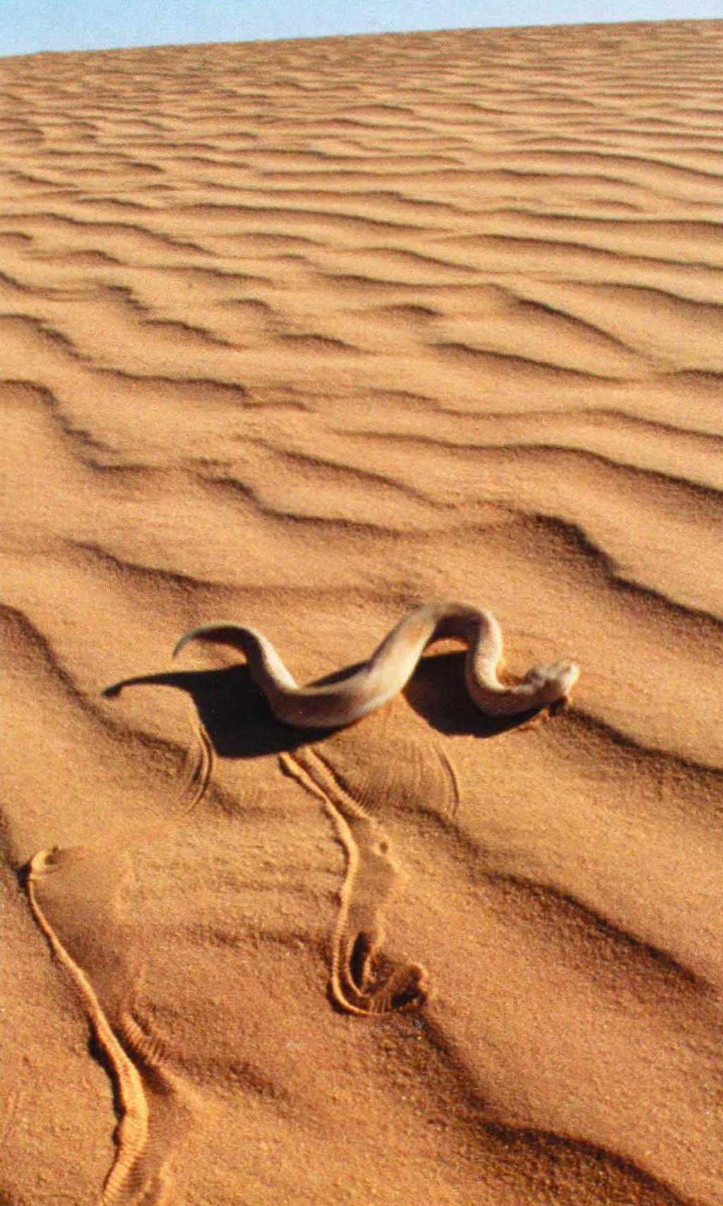 На песчаных дюнах жарких пустынь рогатая гадюка чувствует себя как дома. Движется она боковым ходом, забрасывая заднюю часть туловища вперед и вбок.