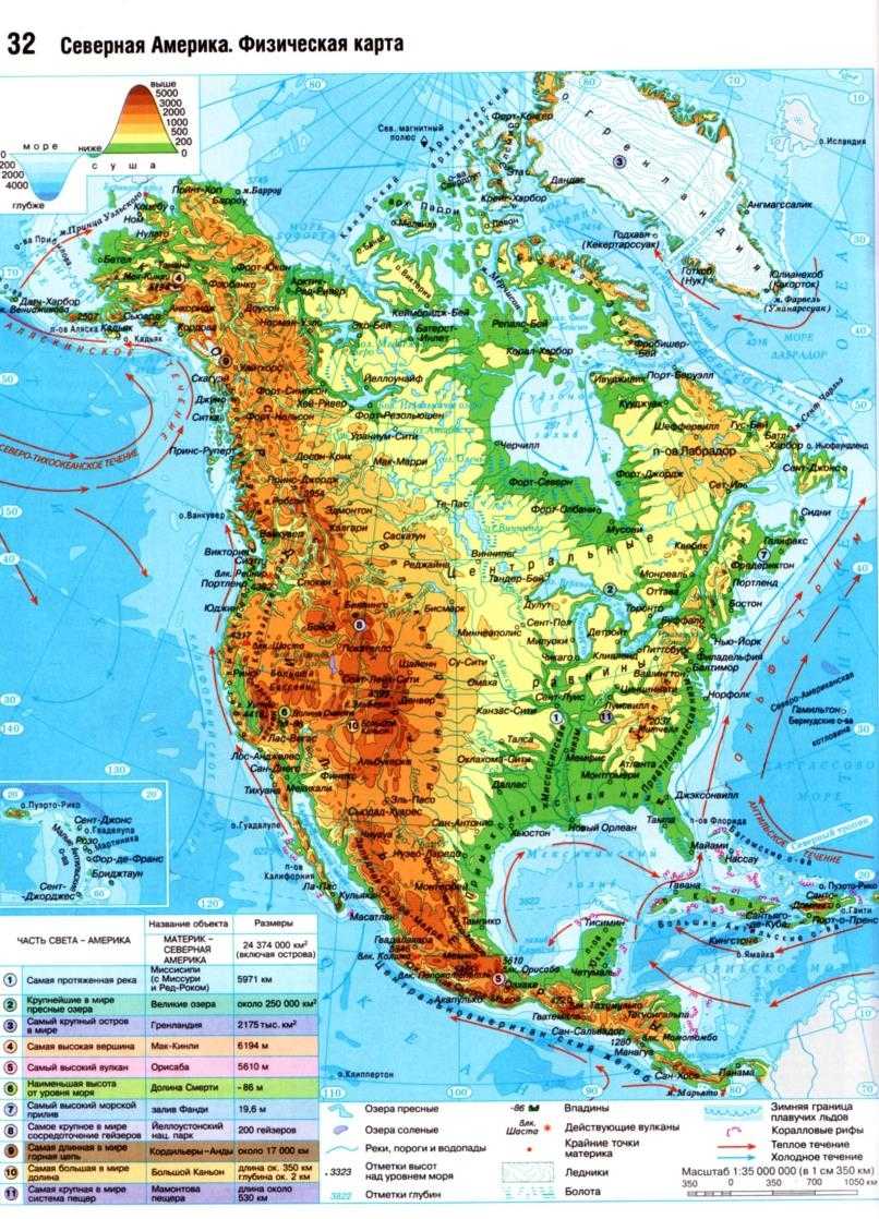 Североамериканский континент расположился в Западном полушарии. Это третий по величине материк на планете, общая площадь его — 24 млн км2.