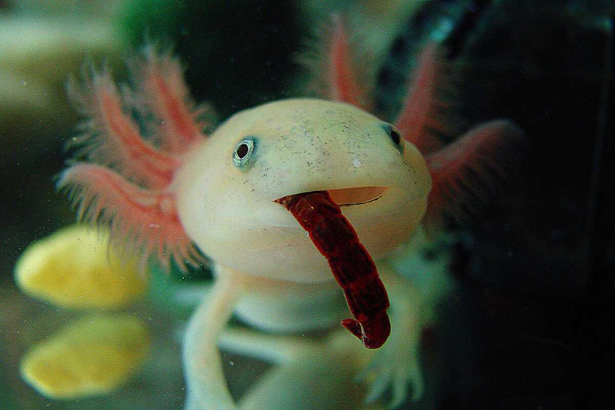 Аксолотль — ночной хищник. Основой его питания при аквариумном содержании должна быть белковая пища.